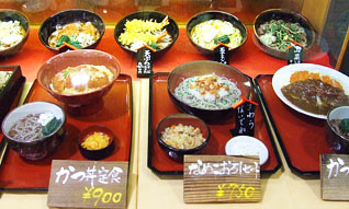Das gängigste Essen sind sogenannte Onigiri, ein handliches Stück Reis mit Füllung (Fleisch, Fisch, Gemüse, Pflaume, etc. - für Nicht-Japanisch-Lesen-Könnende immer wieder eine Überraschung). Oftmals mit einem Algen-Blatt (Nori) umhüllt.